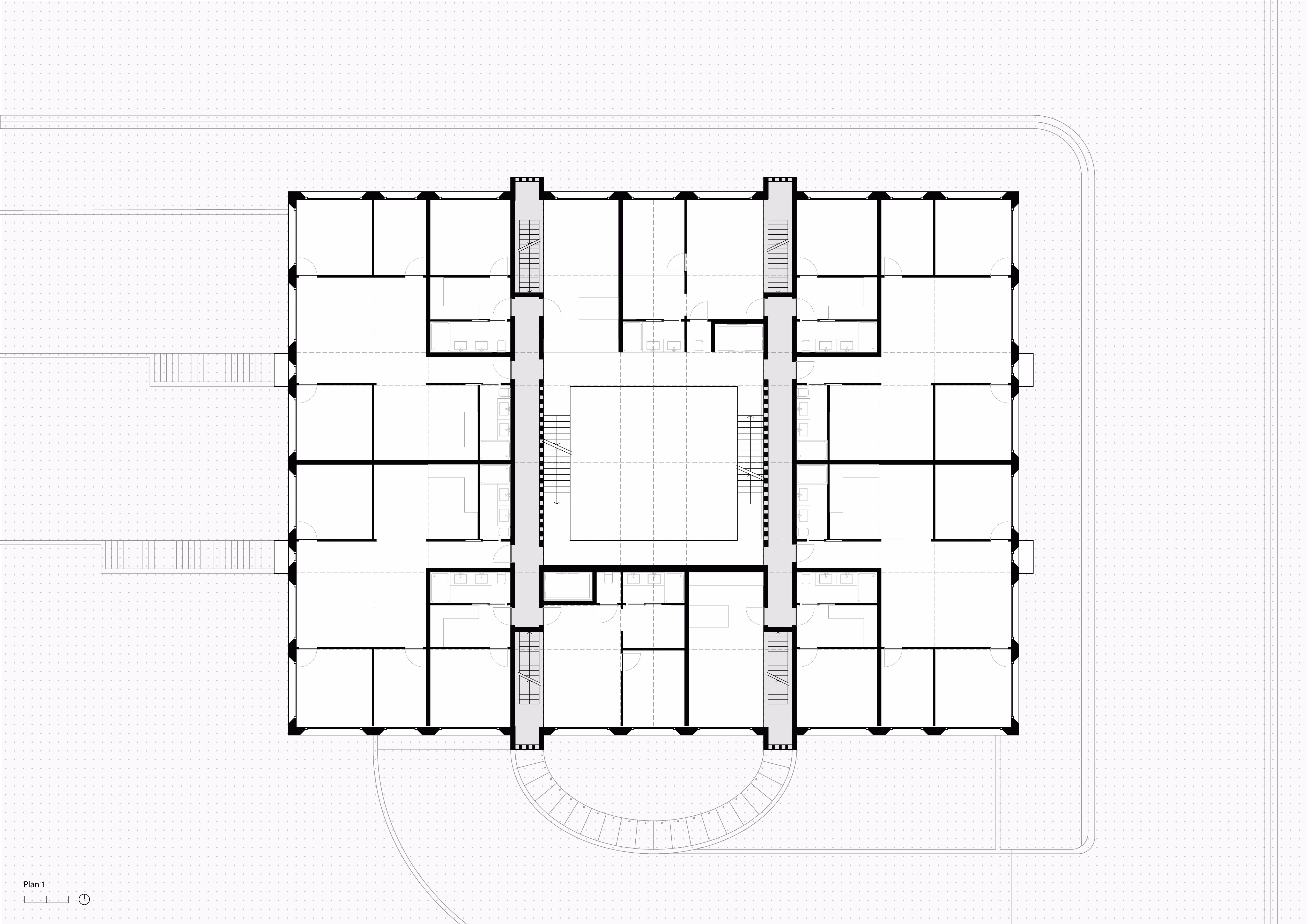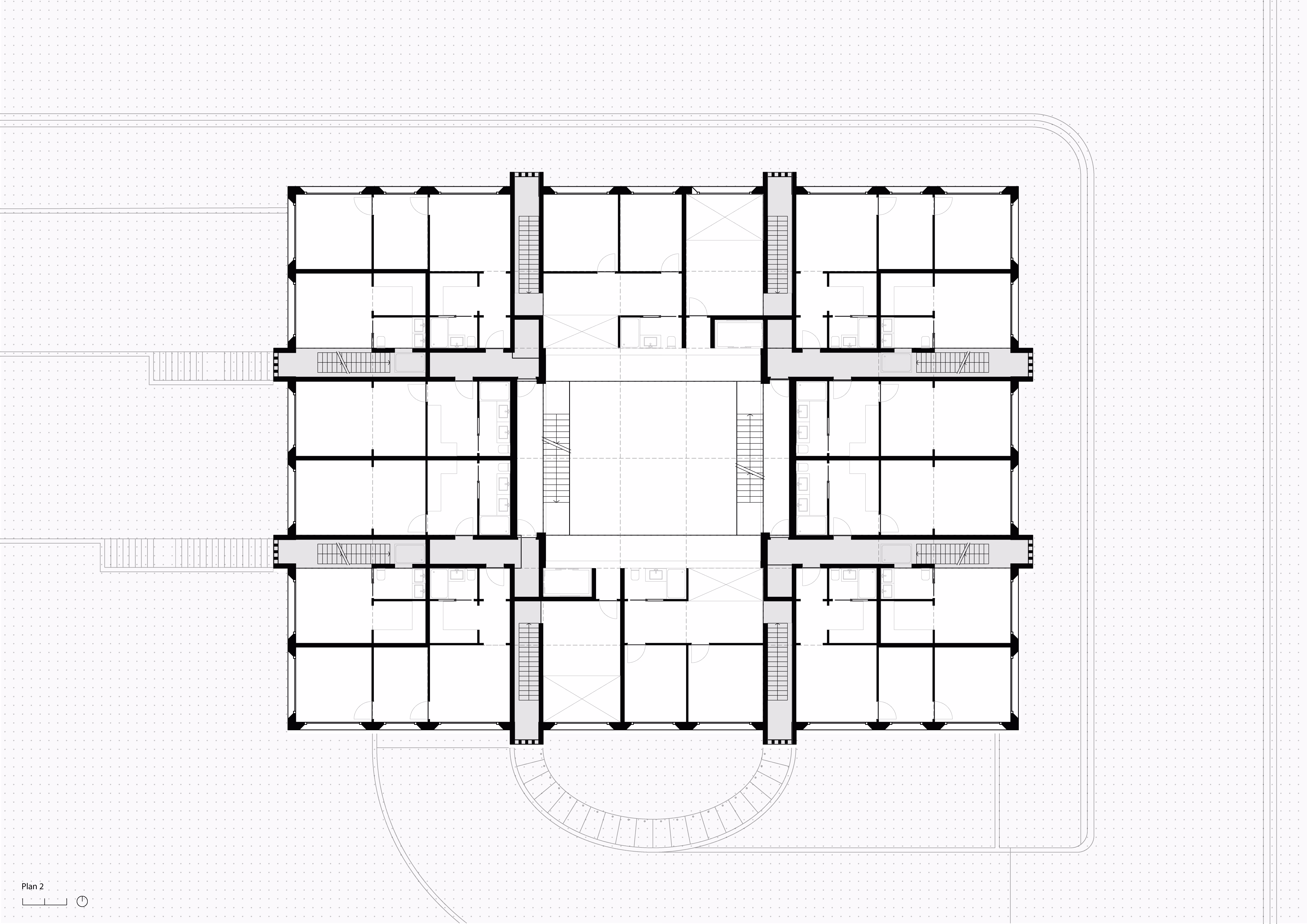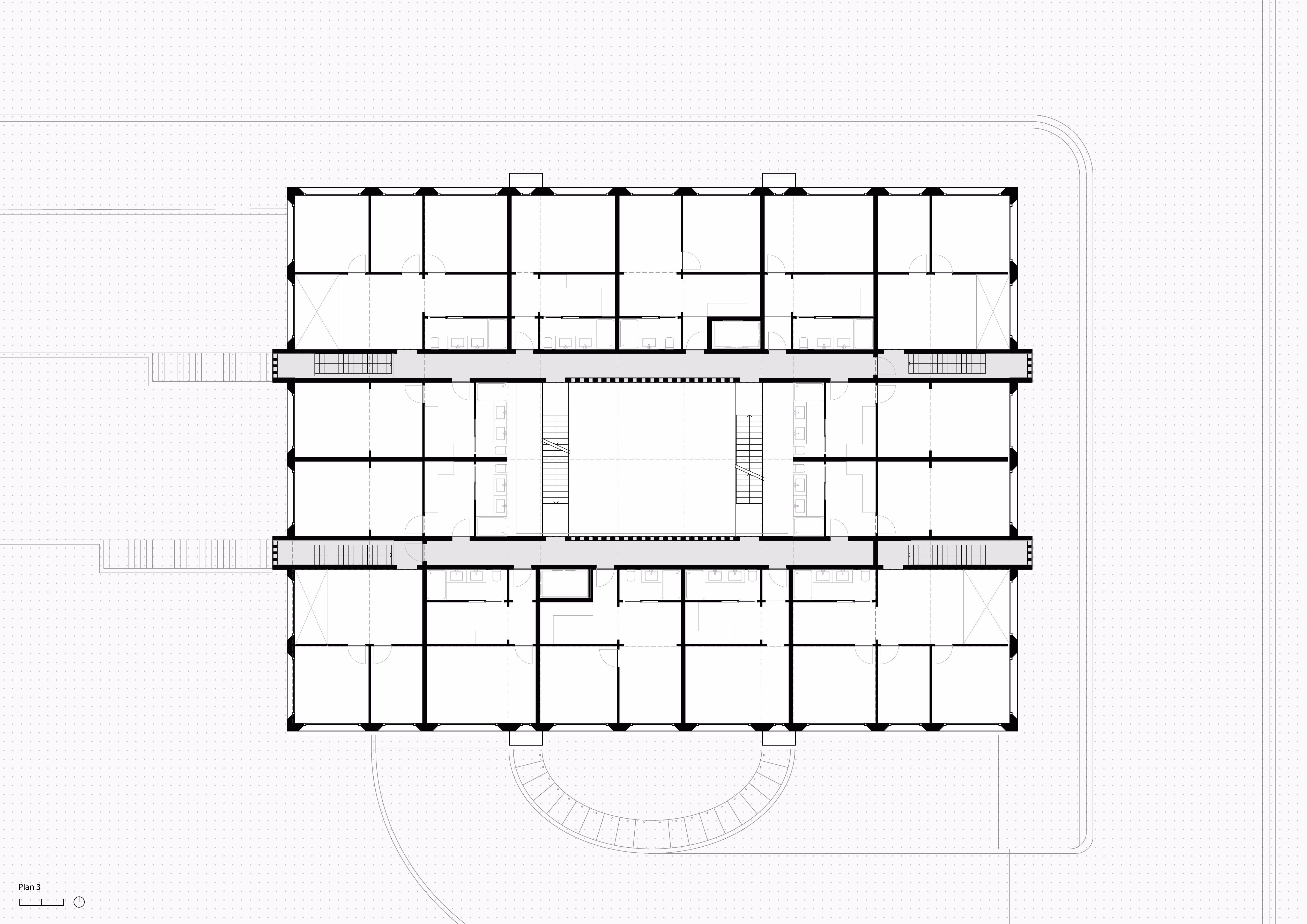 Ce studio vise à questionner la densité des projets de logement à partir de la conception de 80 logements, allant du T1 au T5, tout en respectant une empreinte au sol définie. Avec Oscar Lachaud, notre approche est double : celle d'une division primaire par des éléments rectilignes, et celle d'une organisation des logements par la trame. L'immeuble fonctionne par blocs de trois étages. Ces blocs sont la conséquence d'une rotation des éléments rectilignes initiaux, un parti pris qui favorise la conception d'appartements en duplex.